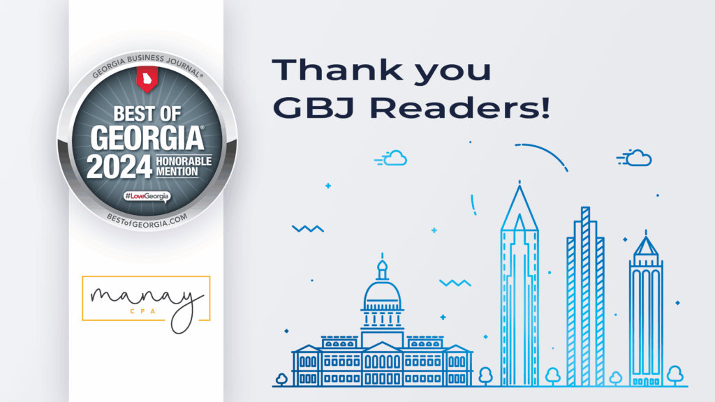 Atlanta, GA – December 2024 – Manay CPA is proud to announce that it has been awarded an Honorable Mention in the 2024 Best of Georgia Awards by the readers and editors of Georgia Business Journal in the Accounting Firms category. This recognition highlights Manay CPA’s commitment to excellence, client satisfaction, and professional integrity in the financial services sector.